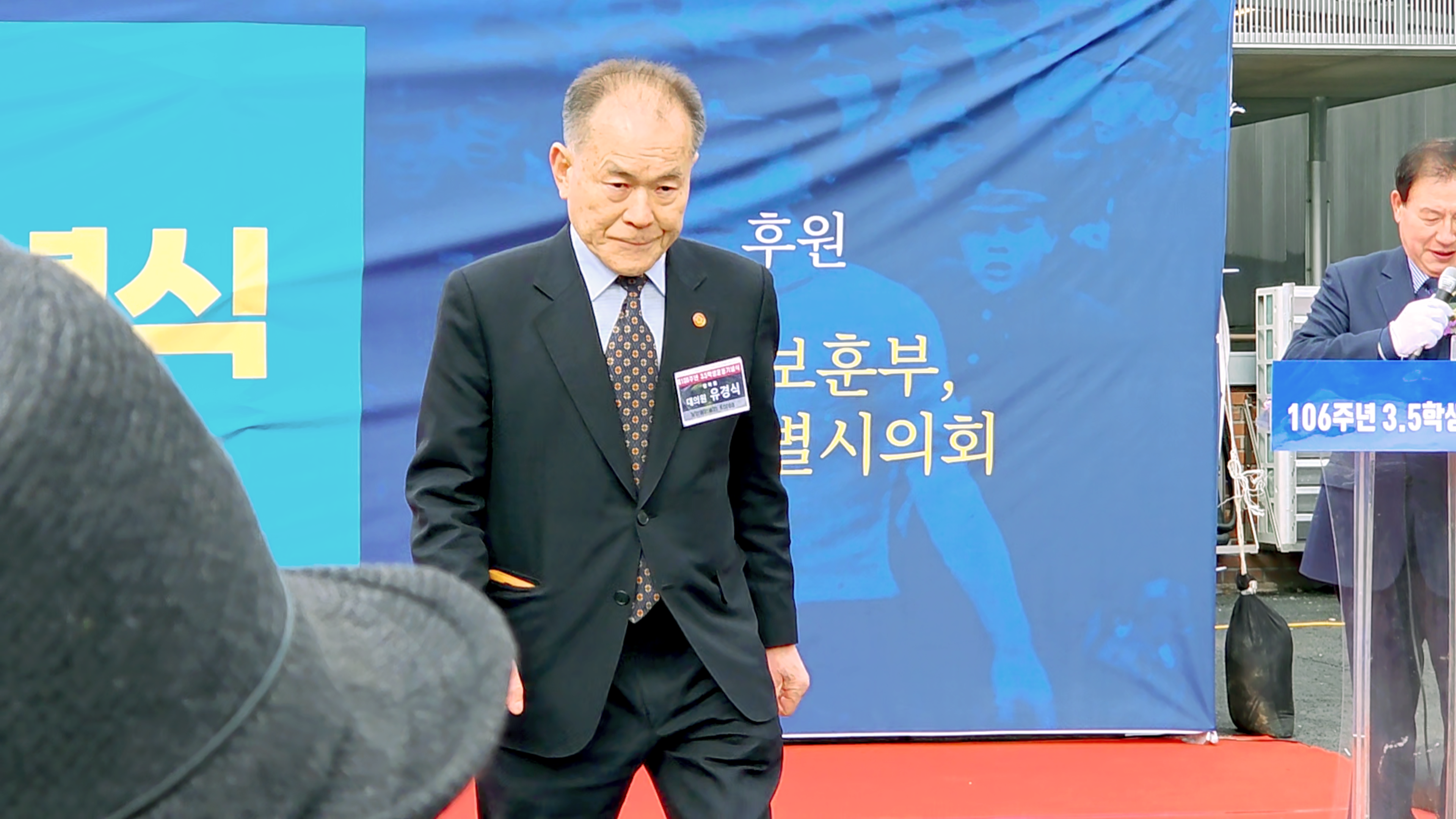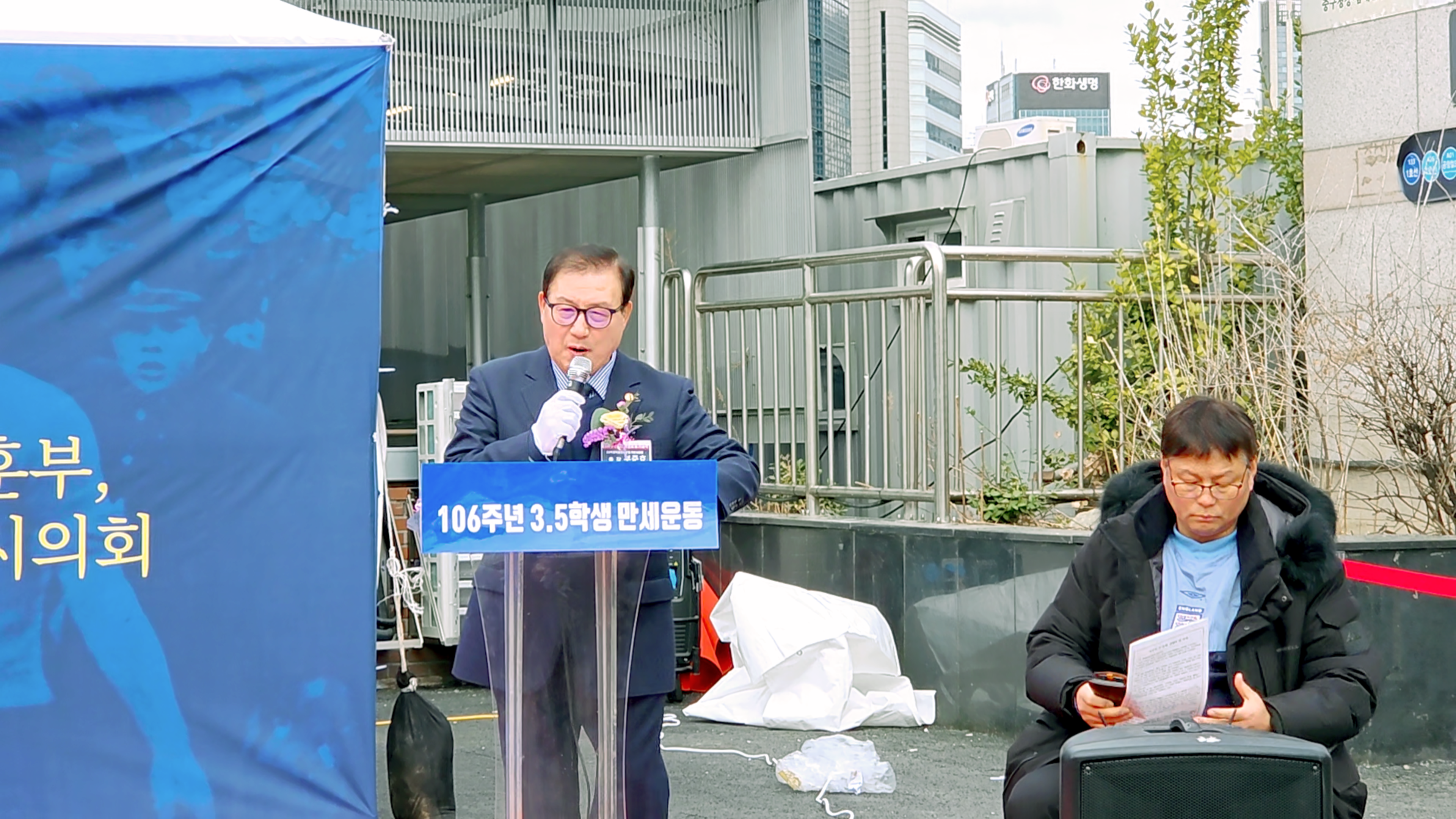 다음 축사는 옥재은 서울시의회 의원이 의장대리로 참석하여 독려의 축사를 하여 성원하여 주었으며 다음 축사자로 유민 학술원장(광복회 학술원)의 축사와 송태원 박사(광복회 대의원)의 축사로 3.5학생항일만세 운동 기념식을 성원하여 주시었다.