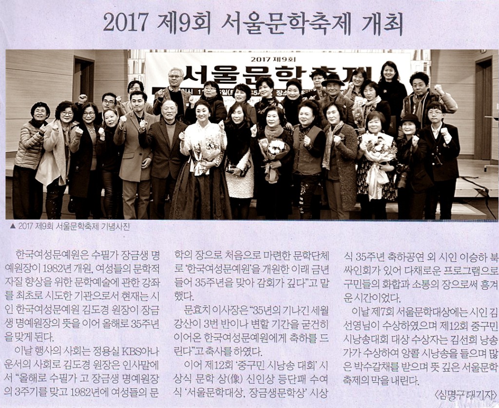 Re:2017 제9회 서울문학축제 성료(신문보도) 작성자상록수/심명구|작성시간17.11.29|조회수27 목록 댓글 0 글자크기 작게가 글자크기 크게가 다음검색 현재 게시글 추가 기능 열기 북마크 공유하기 신고 센터로 신고 댓글 댓글 0 댓글쓰기 답글쓰기 댓글 리스트