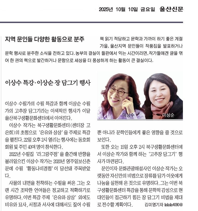 이상수 수필특강 작성자북구생활문화센터|작성시간25.11.04|조회수3 목록 댓글 0 글자크기 작게가 글자크기 크게가 다음검색 현재 게시글 추가 기능 열기 북마크 공유하기 신고 센터로 신고 댓글 댓글 0 댓글쓰기 답글쓰기 댓글 리스트