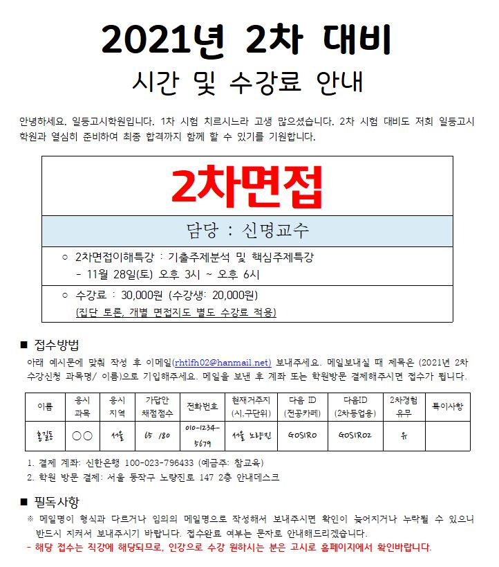 [면접 특강]2021학년도 2차 면접 특강 안내 작성자도덕윤리 교사|작성시간20.11.23|조회수36 목록 댓글 0 글자크기 작게가 글자크기 크게가 다음검색 현재 게시글 추가 기능 열기 북마크 공유하기 신고 센터로 신고 댓글 댓글 0 댓글쓰기 답글쓰기 댓글 리스트