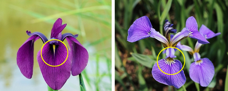 이에 비해 붓꽃은 바깥 화피의 아래쪽에 있는 무늬가 보다 넓으며 흰색과 노란색이 섞여 있다. 즉 붓꽃은 보라색 꽃잎의 안쪽에 흰색(그보다 더 안쪽은 노란색) 부챗살 모양의 무늬가 있다는 점으로 구분할 수 있다