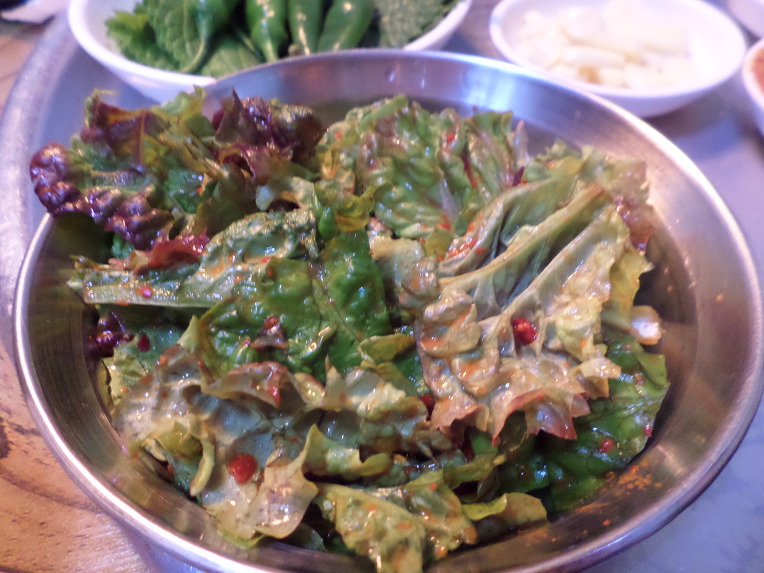 싱싱한 상추에 고춧가루, 식초, 설탕을 넣어 정성으로 무쳐낸 겉절이는 새콤상큼한 맛으로 식욕을 돋우고 고기를 더 맛있게 먹을 수 있도록 해줍니다.