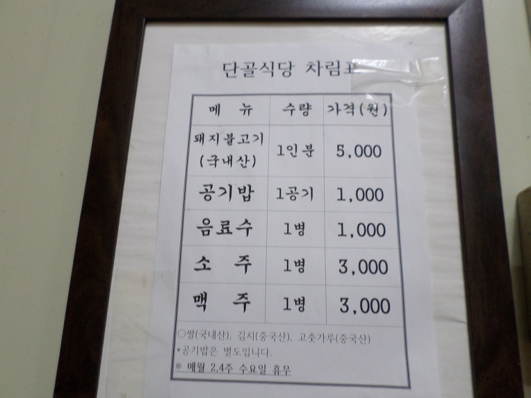 메뉴는 단 1가지 연탄석쇠돼지불고기 뿐 입니다. 가격은 1인분 5천원으로 정말 착한가격 이며 돼지고기는 국내산을 사용한다고 합니다.