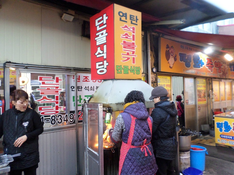 칠성시장 네거리에서 우일완구가 있는 종합상가아파트쪽 골목으로 들어서면 좌측 첫번째 골목이 족발과 연탄석쇠불고기를 파는 식당들이 들어선 곳입니다. 골목 바닥에 기름이 많이 부착되어 있고 족발과 수육 돼지껍데기가 가득 쌓여 있는 골목입니다.
