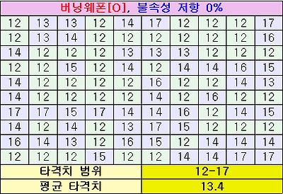 버닝웨폰, 불저항 0% ▶ 타격치 범위 : 12-17, 평균적으로 가한 대미지 : 13.4