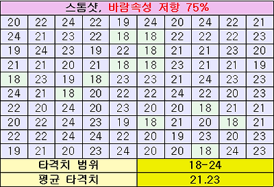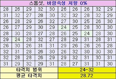 스톰샷, 바람저항 0% ▶ 타격치 범위: 24-32, 평균적으로 가한 대미지 : 28.72