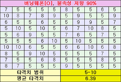 버닝웨폰, 불저항 90% ▶ 타격치 범위 : 5-10, 평균적으로 가한 대미지 : 6.39