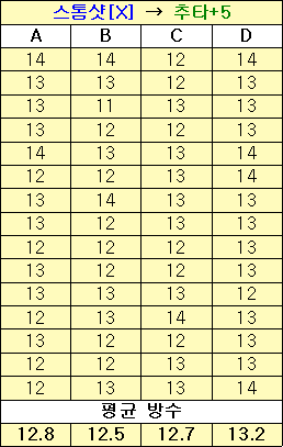 스톰샷은 차이가 거의 없었던 것에 반해 덱스 수치에 의한 타격치 변동은 차이가 많이 나타났습니다.