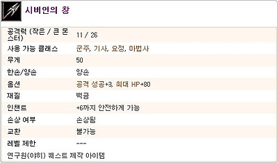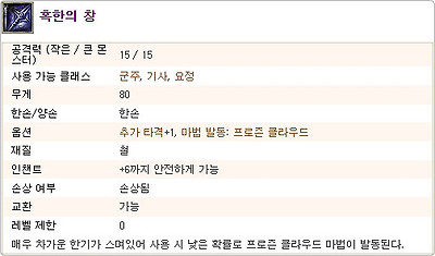 반면, 혹한의 창은 한손 계열로써 결코 낮지않는 공격력 또한 특수한 마법발동 때문에 군주 클래스를 육성하는 분들에겐 최고의 창 계열 무기가 되지않을까 생각합니다.