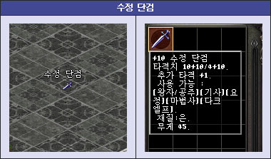 수정 단검은 기본 타격치 10/4와 추가타격+1의 옵션을 가지고 있습니다. 언데드 공략 시에 더 없이 좋은 성능을 발휘하며, 단검류임을 감안한다면 작은 몬스터 데미지가 대단히 높게 설정되어 있기 때문에 다양하게 활용이 가능한 아이템입니다.