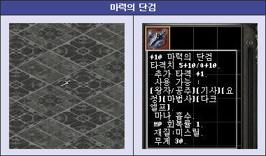 마력의 단검은 기본 타격치 5/4와 추가타격+1, MP회복+1, MP흡수 옵션을 가지고 있습니다. 타격치 자체는 크게 높은 편은 아니지만 재질 특성에 따른 언데드 추가 데미지가 부여되어 언데드 사냥시 탁월한 능력을 발휘하는 아이템입니다.