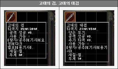 고대의 검과 고대의 대검은 실로 놀라운 기본 타격치를 가지고 있는 무기인데요. 고대의 검은 35/20 공격성공+5, 고대의 대검은 27/45 공격성공+3 추가타격+3의 옵션을 가지고 있습니다. 고대의 검은 소울 오브 프레임을 배운 요정들이 즐겨 사용하는 검으로 알려져 있습니다.