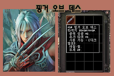 핑거 오브 데스는 기본 타격치 16/4, 추가타격+1, 공격성공+2의 옵션을 가지고 있으며, 일정확률로 상대방에게 독 대미지를 줄 수 있습니다.