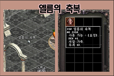 엘름의 축복은 요정 숲 마을에 있는 네루파를 통해 제작할 수 있는 요정들의 국민 투구로 방어력 -2와 DEX+1의 옵션을 지니고 있어 활을 주무기로 사용하는 요정 클래스가 많이 사용하는 방어구 중 하나입니다.