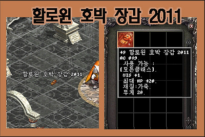 이번 2011년 할로윈 데이에 새롭게 출시 된 할로윈 호박 장갑 2011은 기본 방어력0, 최대 Hp+20, WIS+1의 옵션을 지니고 있으며 할로윈 호박 갑옷과 마찬가지로 모든 클래스가 착용 가능합니다. 기존의 장갑들과는 다르게 +6까지 안전하게 인챈트가 되어 높은 방어력을 자랑하며 WIS 스탯을 올려주므로 스탯을 잘 분배하면 MP 회복량에 이득을 얻을 수도 있습니다.