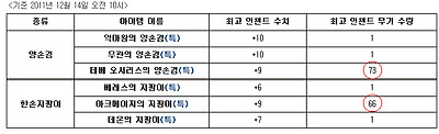 ※ 이벤트 아이템인 테베 오시리스의 지팡이(특), 아크메이지의 지팡이 (특)의 통계가 아님을 알려드립니다.