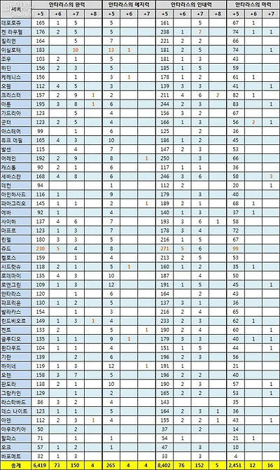 다음은 2012년 2월 13일 기준으로, +5 이상으로 인챈트된 안타라스의 완력과 안타라스의 예지력, 안타라스의 인내력, 안타라스의 마력의 수량이다.