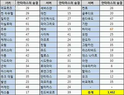 아래는 안타라스 상급 마갑주를 제작할 때 핵심 재료인 안타라스의 숨결이 각 서버별로 얼마나 있는지를 조사한 결과다.