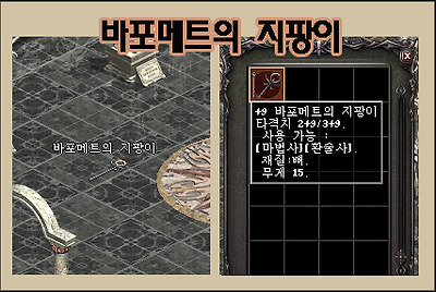 바포메트의 지팡이는 마법을 발동하는 아이템으로, 기본 타격치 2/3, 물리 공격 시 일정 확률로 이럽션이 발동되는 옵션을 지니고 있습니다. 일정 확률로 발동되는 이럽션은 캐릭터의 레벨과 INT의 영향을 받습니다. 또한, 재질은 뼈로 +1부터 실패할 가능성이 있으며 글루디오 던전 6층의 속박된 영혼과 야히의 분신을 통해 제작할 수 있습니다. 단, 마력을 잃은 바포메트의 지팡이의 봉인을 풀기 위해서는 48레벨 이상의 캐릭터의 희생을 필요로 합니다.
