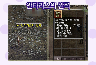 안타라스의 완력은 기본 AC-10, HP 회복+4, 대미지 리덕션+3, 땅 속성 저항+50, 독 내성의 옵션을 지니고 있습니다. 다른 마갑주과 비교하면 MP회복이나 HP회복 능력이 다소 미흡하지만 인챈트 안전선인 +5까지 인챈트를 해도 AC-15를 확보할 수 있는 장점을 가지고 있습니다. 완력은 오직 기사 클래스만 착용할 수 있습니다.