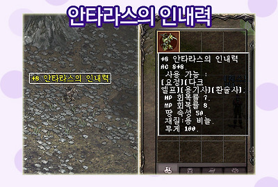 안타라스의 인내력은 기본 AC-8, HP 회복+8, MP 회복+8 그리고 안타라스 마갑주의 공통 옵션인 대미지 리덕션+3, 땅 속성 저항+50, 독 내성의 옵션을 지니고 있습니다. MP 회복과 HP 회복 어느 하나 빠질 것 없이 균형 잡힌 옵션을 지니고 있고 사용 가능한 클래스 또한 요정, 환술사, 다크엘프, 용기사로 가장 많아 수요가 높은 아이템입니다.