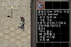 따라서 +8~9 정도의 마력의 단검을 착용했다면 MR 30대와 MR 50대의 언데드 몬스터가 많이 출현하는 버림받은 자들의 땅(그림자)와 오만의 탑 30층대, 50층대, 기란 감옥 2~4층 정도에서 사냥하는 것이 효율적이라고 할 수 있다.