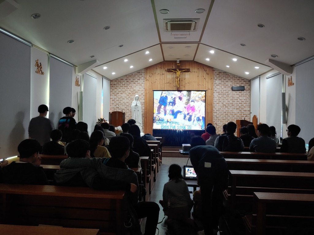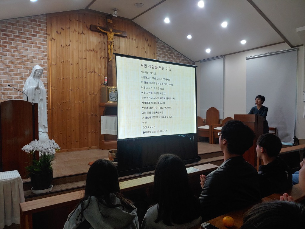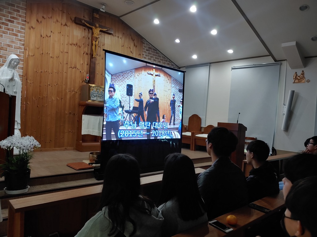 간식먹고 성당안으로 들어가 서면성당의 소개영상을 보았어요!