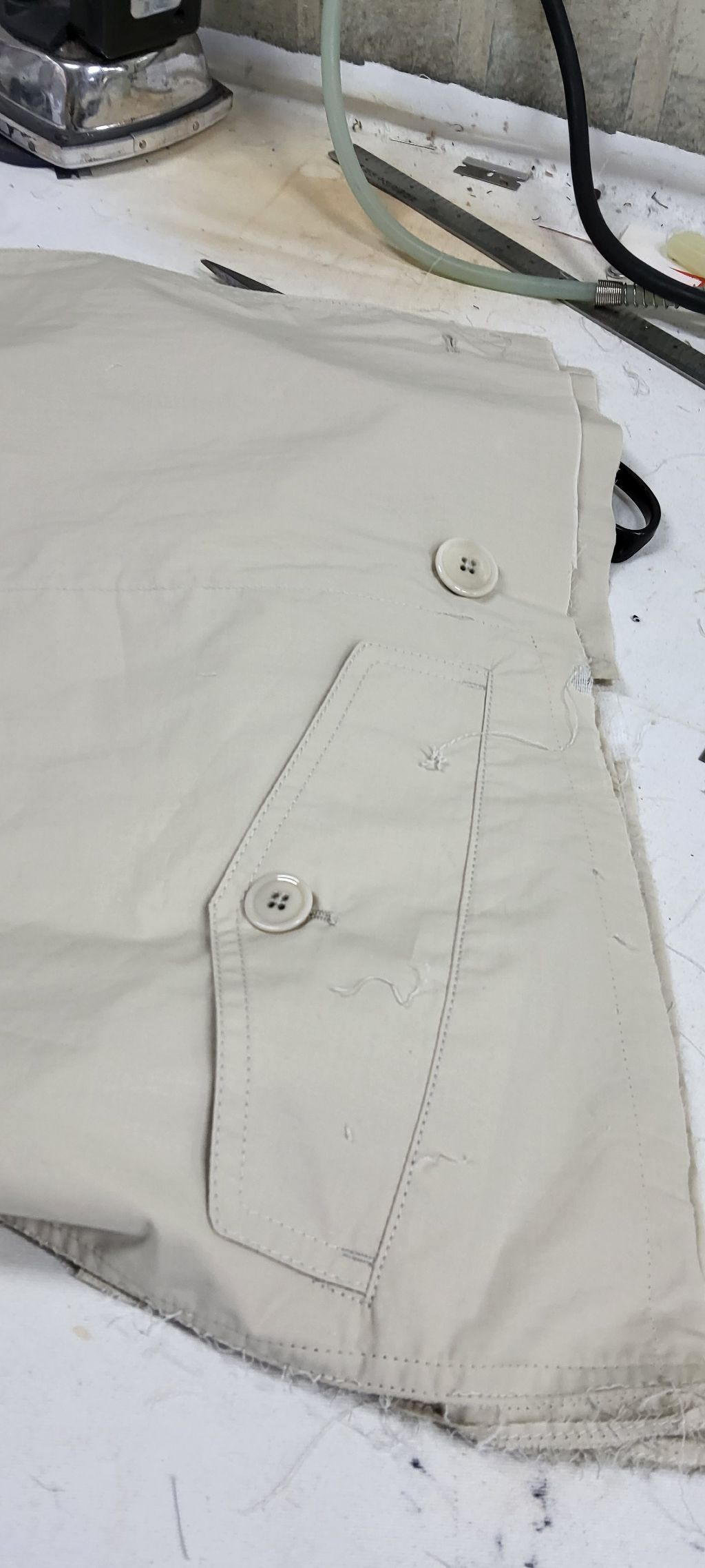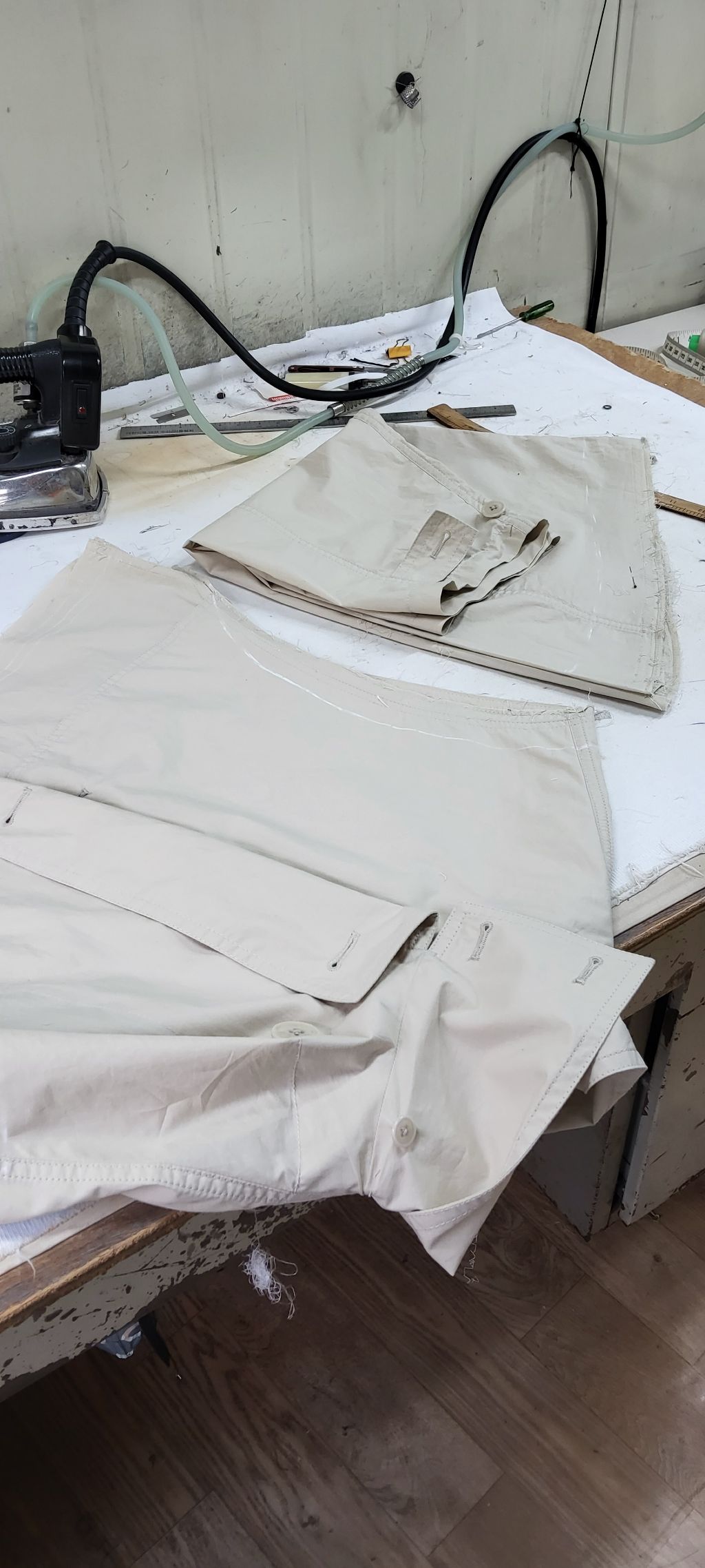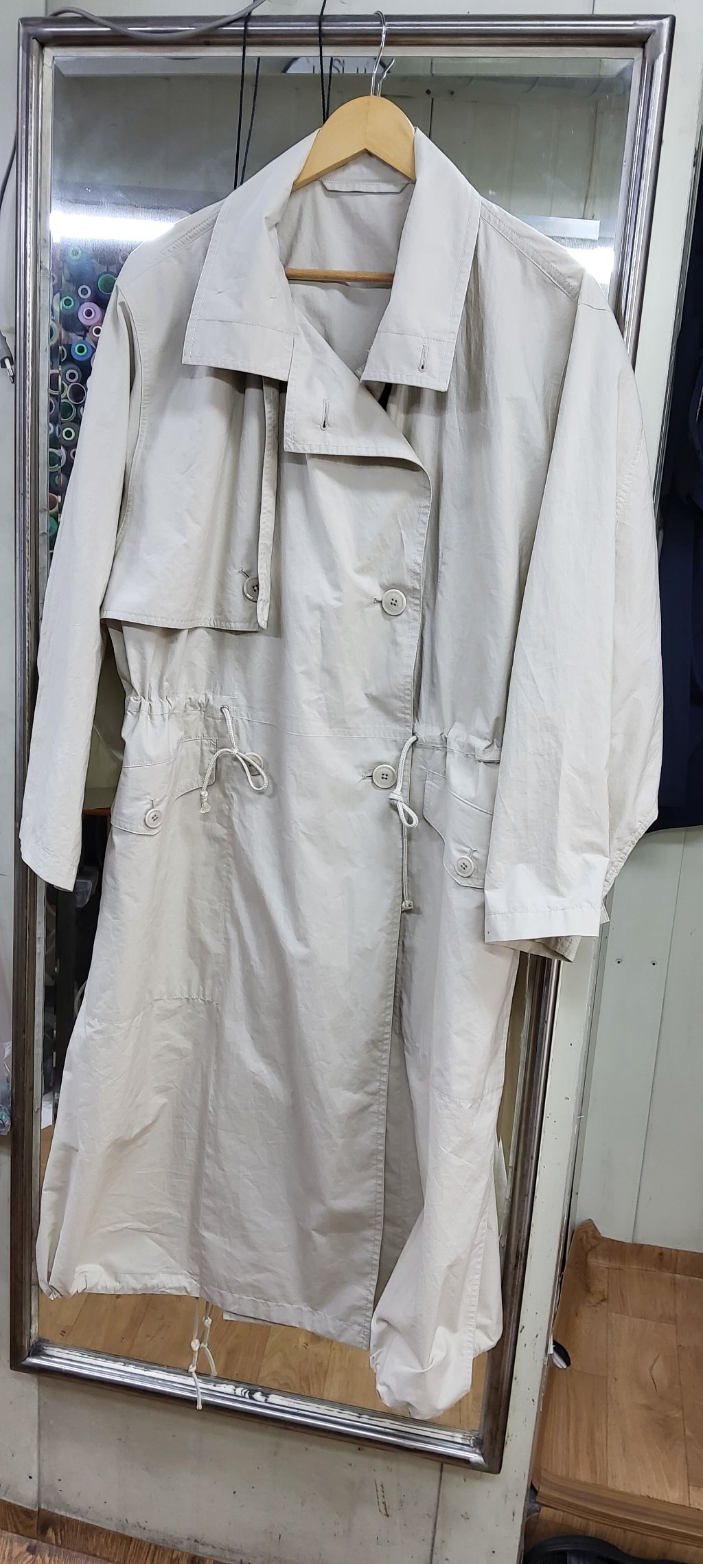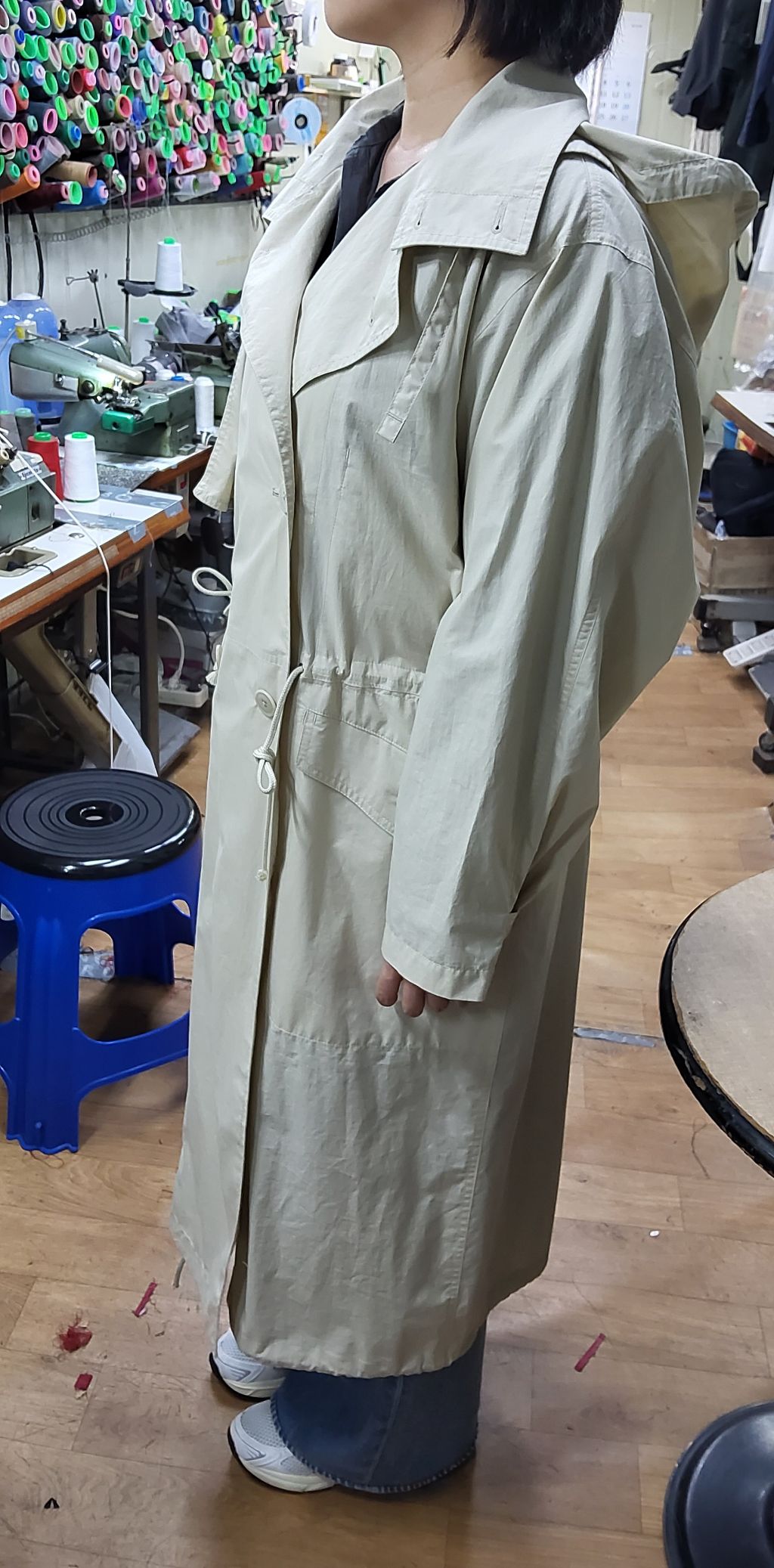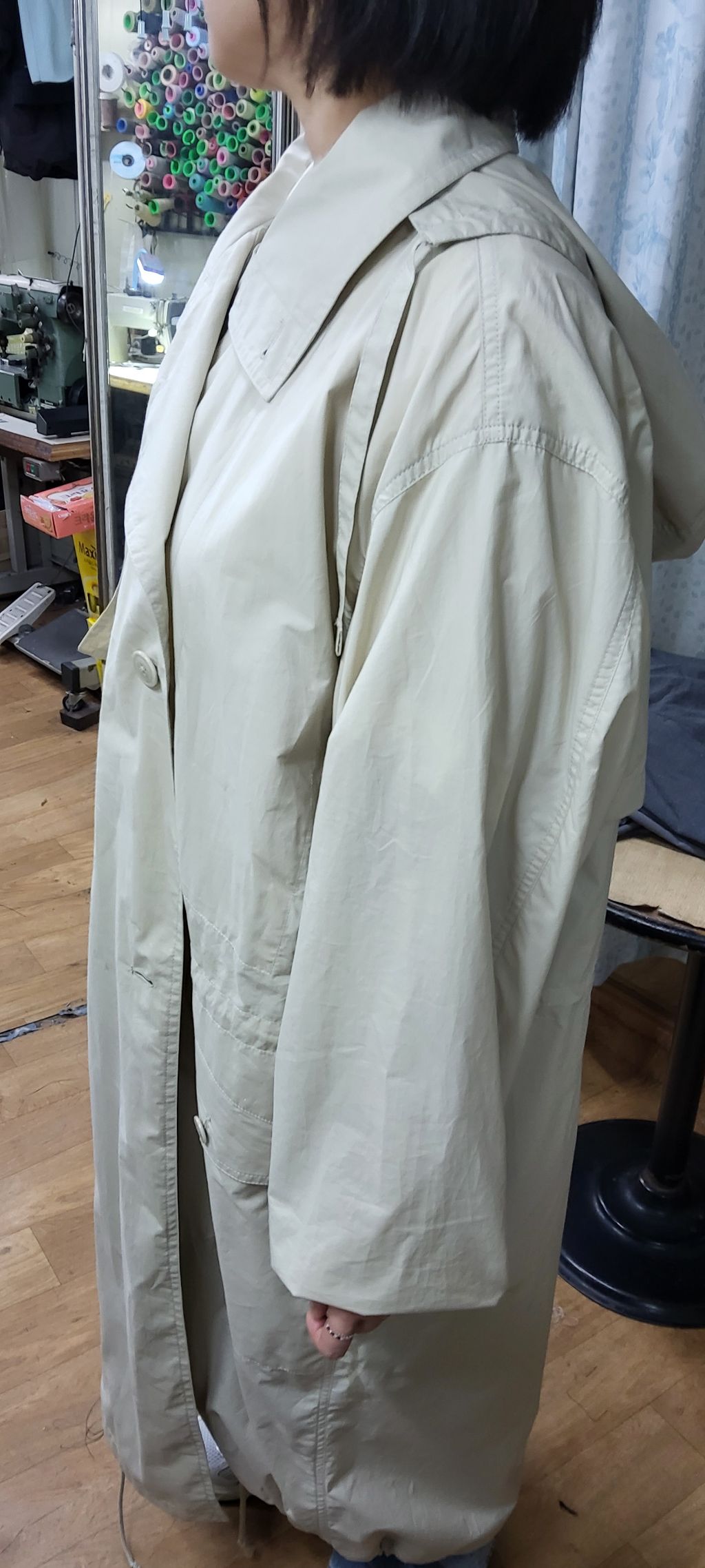 허리선을 9cm 올리고, 어깨·품·소매 등 전체적인 사이즈를 조정한 수선 전후 과정입니다.