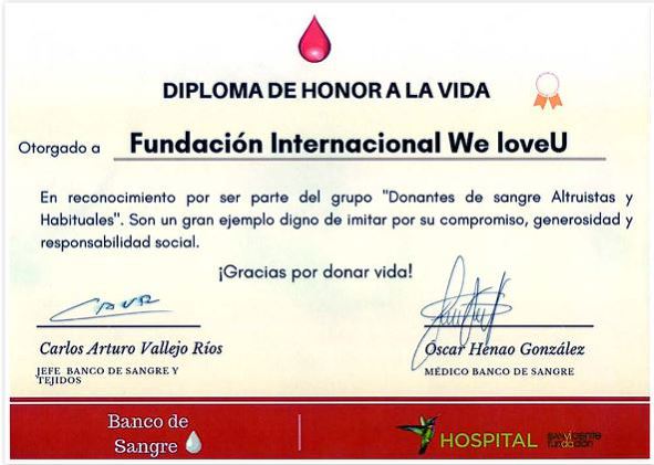 수상내역 - 국제위러브유운동본부(회장 장길자) 세이브더월드 일환 콜롬비아 산비센테병원 및 혈액은행장 라이프 표창장