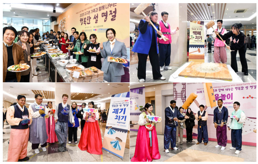 이후 위러브유 회원들이 정성껏 준비한 오찬과 다양한 한국문화체험 프로그램이 진행됐다. 떡국, 갈비, 잡채, 산적 등 갖가지 명절 음식으로 풍성히 차려낸 명절 상이 모두를 맞이했다. 오손도손 담소를 나누며 식사를 마친 참석자들은 떡메치기, 연 만들기, 제기차기, 윷놀이 등 다채로운 체험 부스를 즐겼다. 한복체험존도 인기를 끌었다. 외국인 이웃들은 각자 마음에 드는 한복을 골라 입고 서로의 모습을 사진과 영상으로 남기며 추억을 만들었다. 웃음 소리와 떡메 치는 소리가 한데 어울려 흥겨운 명절 분위기를 더했다.