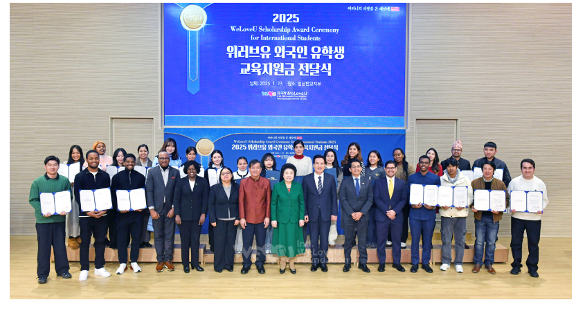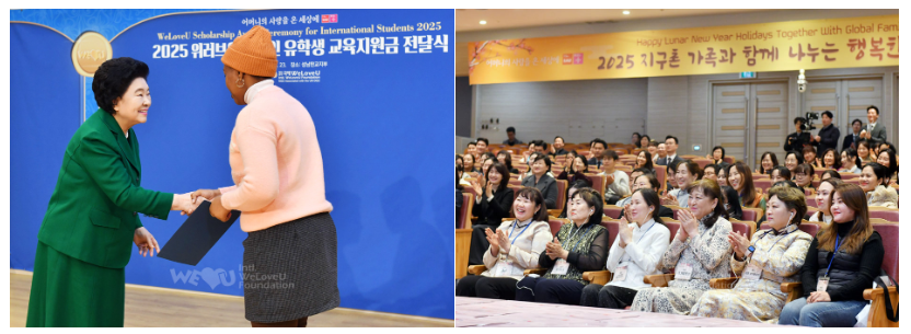 이어 복지소외·다문화가정 1600세대 지원 기증판이 무대에 게시되고, 외국인 유학생 장학증서 전달식이 진행됐다. 위러브유는 나눔과 배려를 베푸는 한국 명절의 의미를 알리고, 학생들이 학업에 집중하며 글로벌 인재로 성장할 기반을 제공하고자 8개국 외국인 유학생 24명에게 총 4800만 원의 교육지원금을 전한다. 장길자 회장은 베트남, 온두라스, 앙골라 등지에서 온 유학생들에게 장학증서를 수여하고 일일이 손잡아 격려했다.