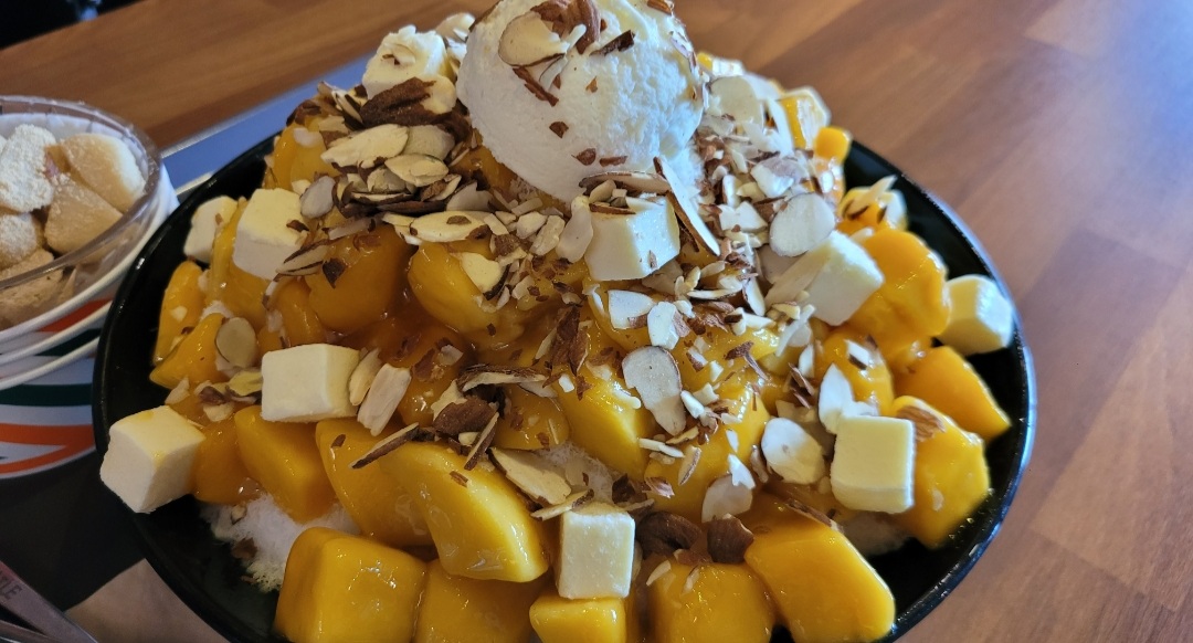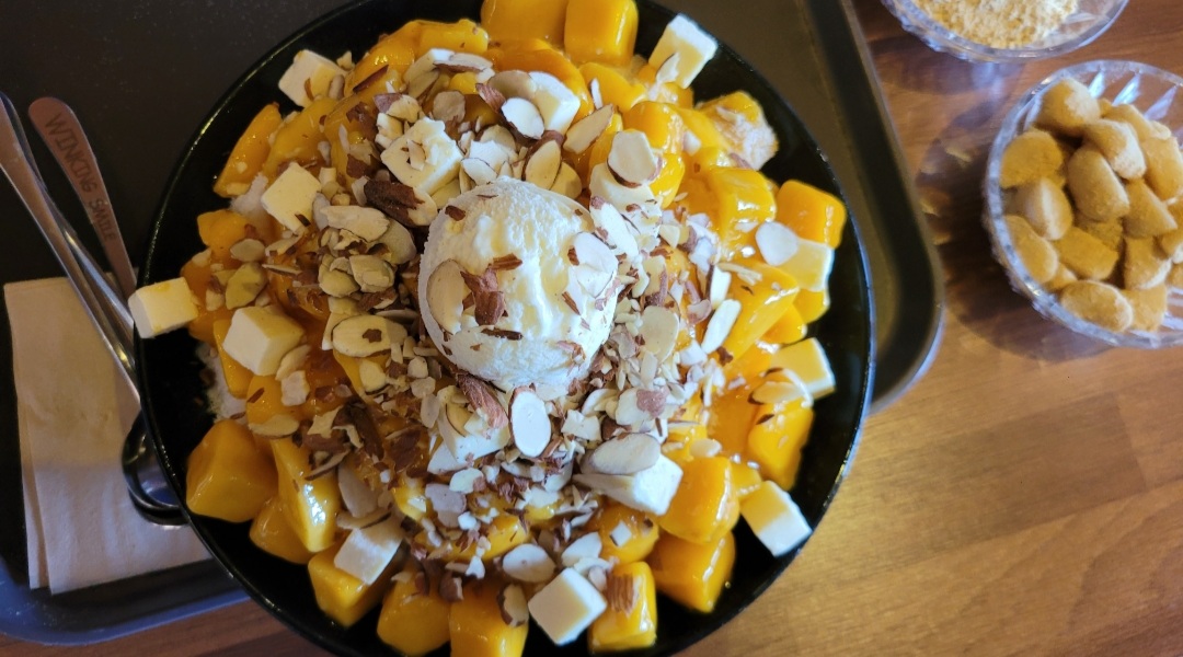 4명이 먹는, 푸짐한 양에 치즈큐브와 망고가 듬뿍 들어가 정말 배부르고 시원하니 맛있답니다.