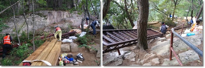 ▼ 용암봉 정상 부근의은 새벽부터 등산로 데크 공사 중.