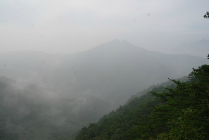 ▼ 용암봉 능선에서 본 만수봉 / 아직 잠에서 깨어나지 않은 듯, 짙은 안개 속에 흐리다.