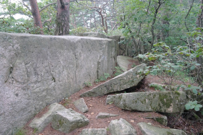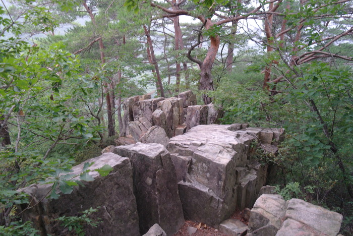 ▼ 용암봉 능선 송암 풍경 - 6 / 물멍진 4각 바위들이 마치 성곽처럼 길게 이어졌다.