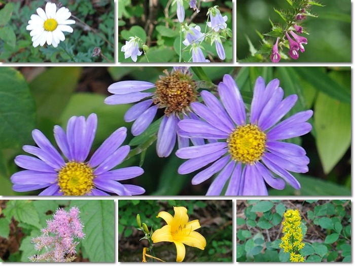 윗열 좌로부터 'ㄹ'자 순 - 구절초. 잔대. 며느리밥풀꽃,벌개미취. 노루오줌. 원추리. 미역취.