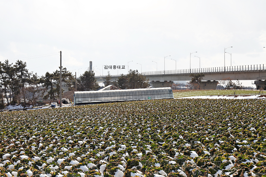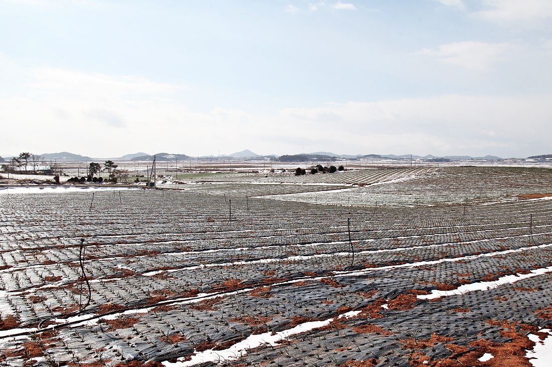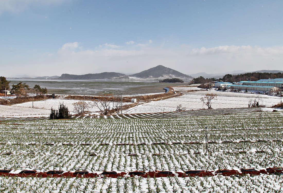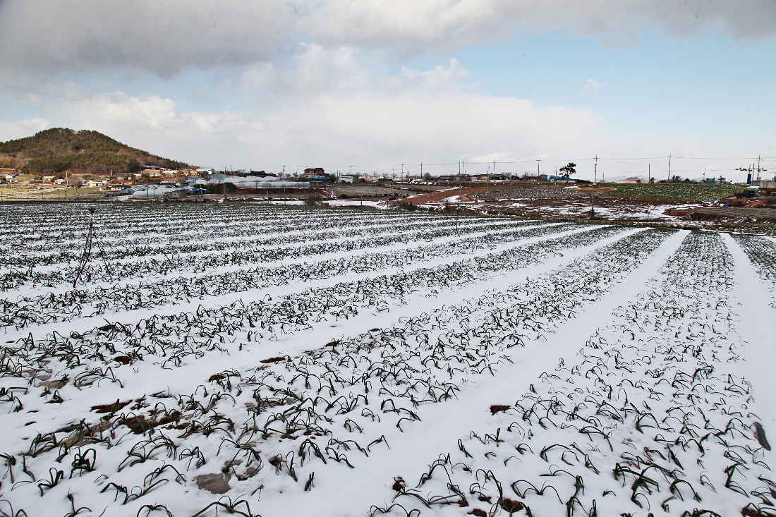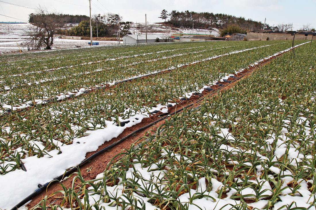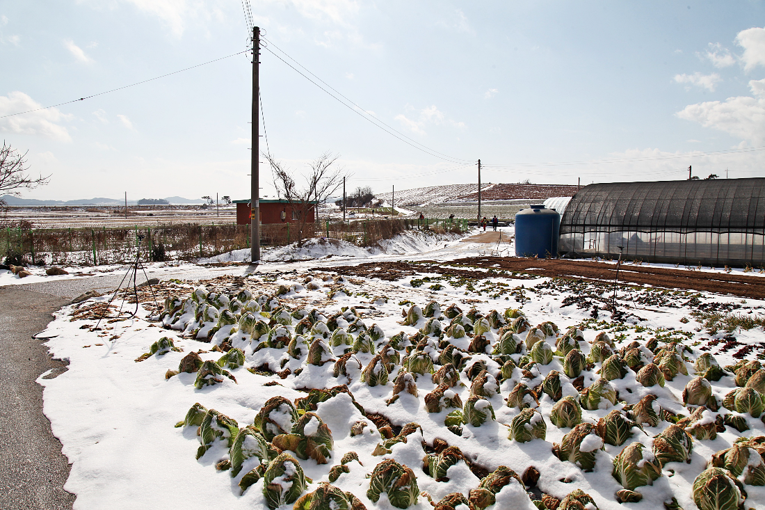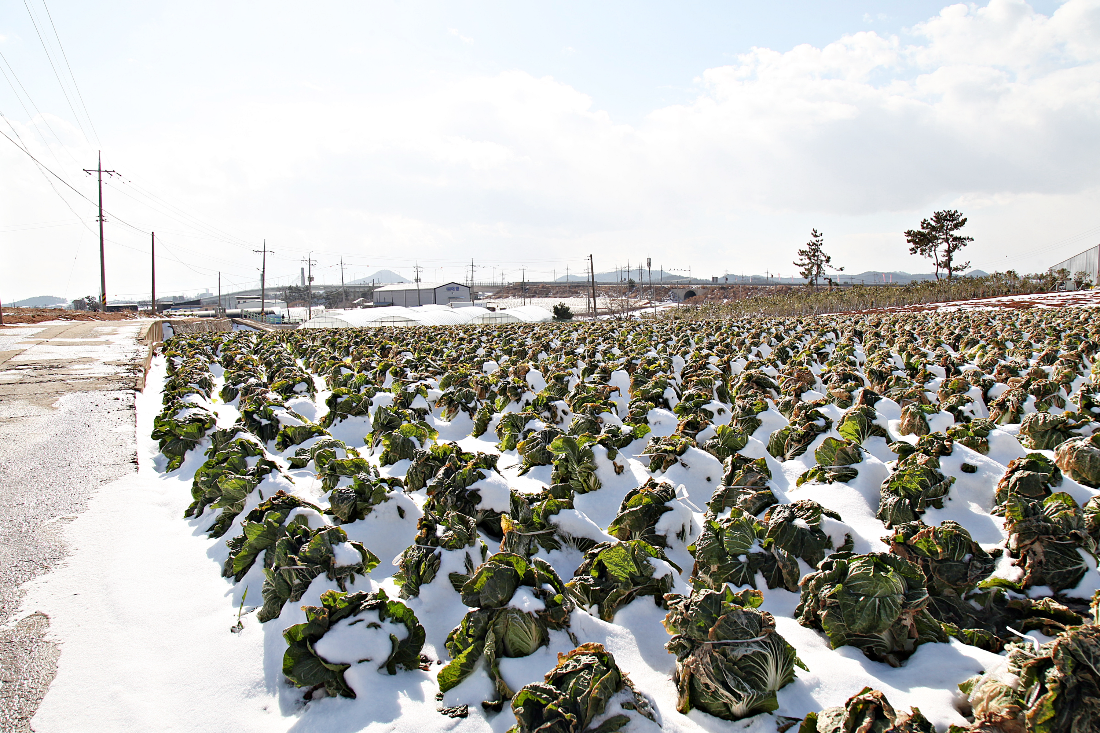양파와 마늘 밭은 눈 속에 더 푸르러 벌써 봄이 온 듯 착각할 정도였다. 뿐만 아니라 이곳엔 출하를 미룬 김장 배추들도 노