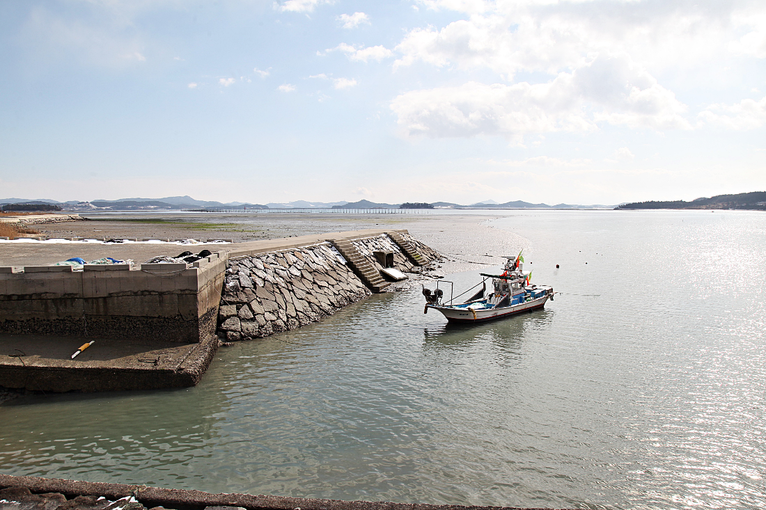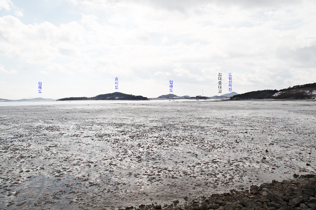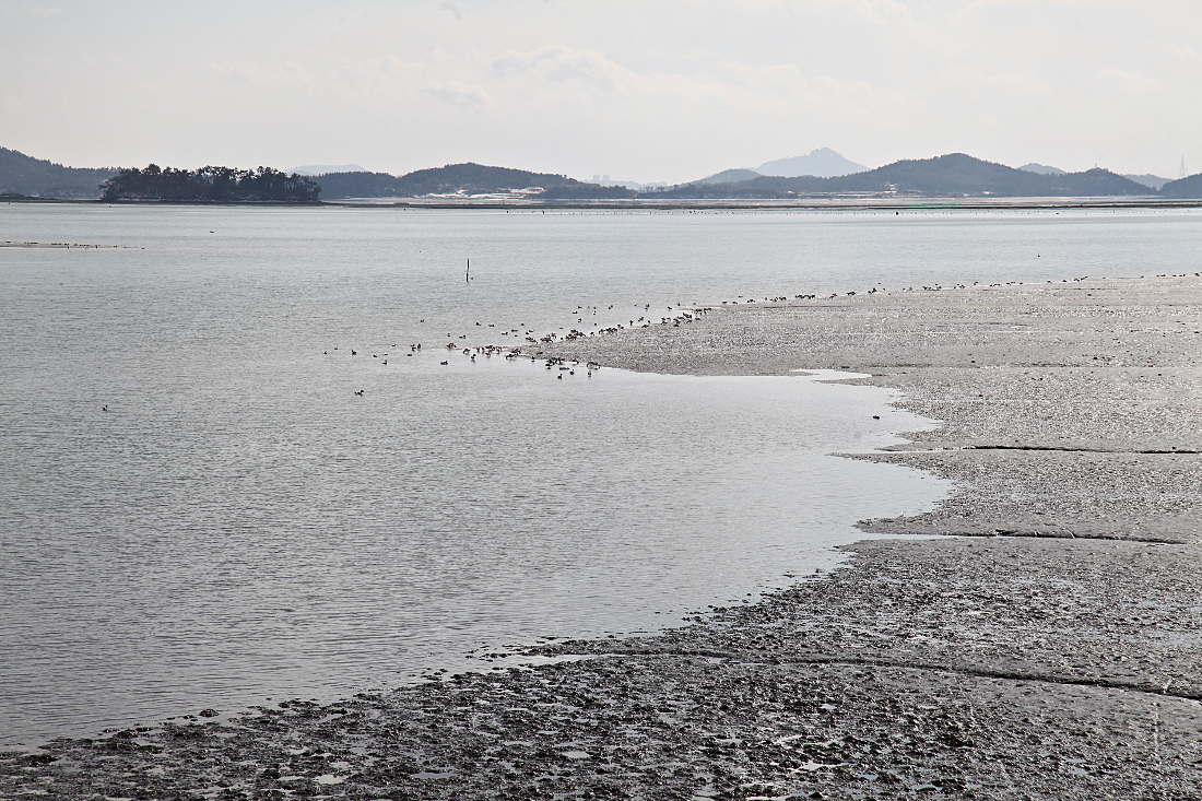 는 썰물의 바다 갯벌 드넓은데, 갯골 따라 멀리 바닷물에 접한 조간대(潮間帶)에는 무리지은 철새들 찾아와 한가로웠다.