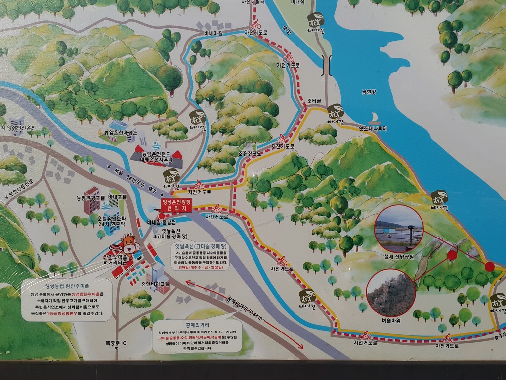 둘레코스 : 양성온천광장- 철새공원-옛조나루터- 조터골- 샛강-조웅장군묘-양성온천
