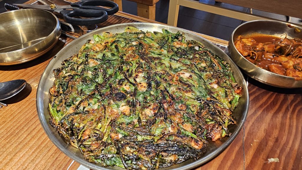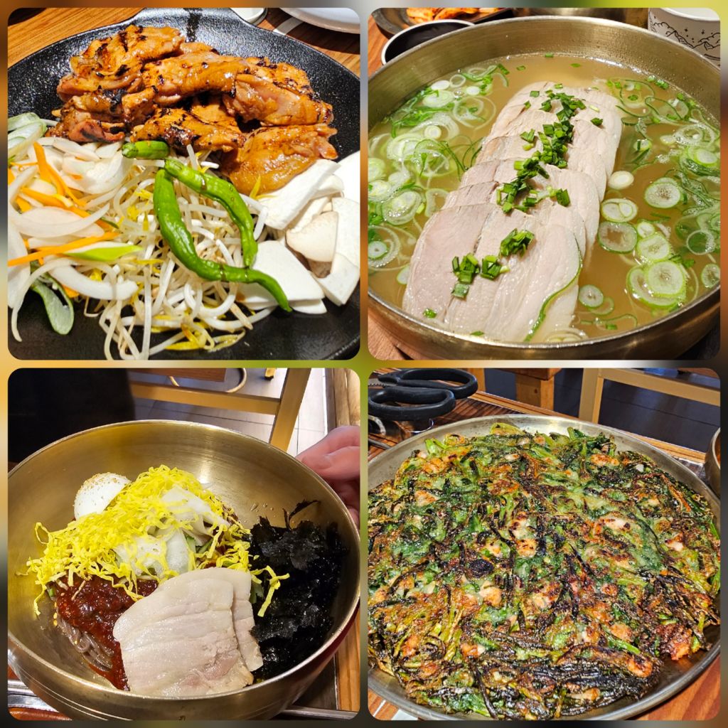 닭목살구이+해물부추전+잡채+샐러드+떡볶이+묵사발이 나온다.