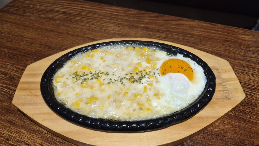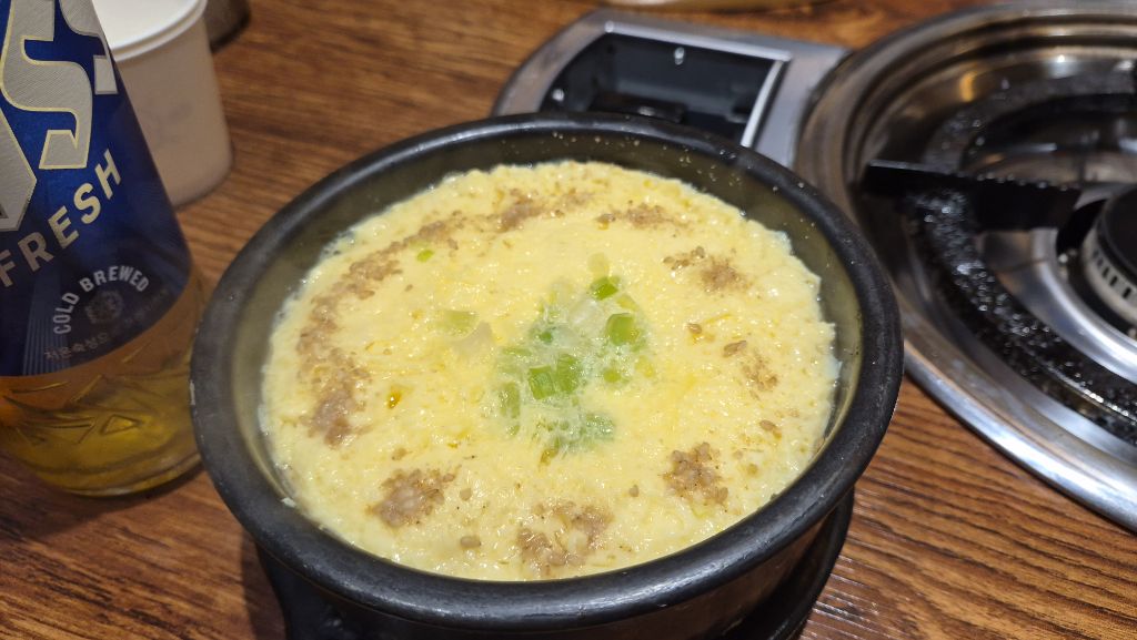 쫄깃하면서 소곱을 맛나게 먹다가 주문한 삼겹살도 한점~ 🍻밑반찬으로 주는 콘치즈도 맛나다.