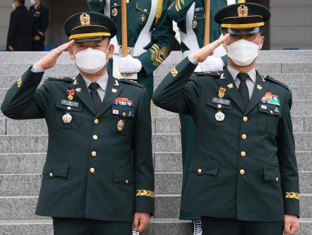 [서울=뉴시스] 21일 계룡대 대연병장에서 거행된 13·14대 육군 주임원사 임무교대식에서 신임 강필수(왼쪽) 주임원사와 전임 김채식 주임원사가 경례하고 있다. 2021.01.21. (사진=육군 제공)