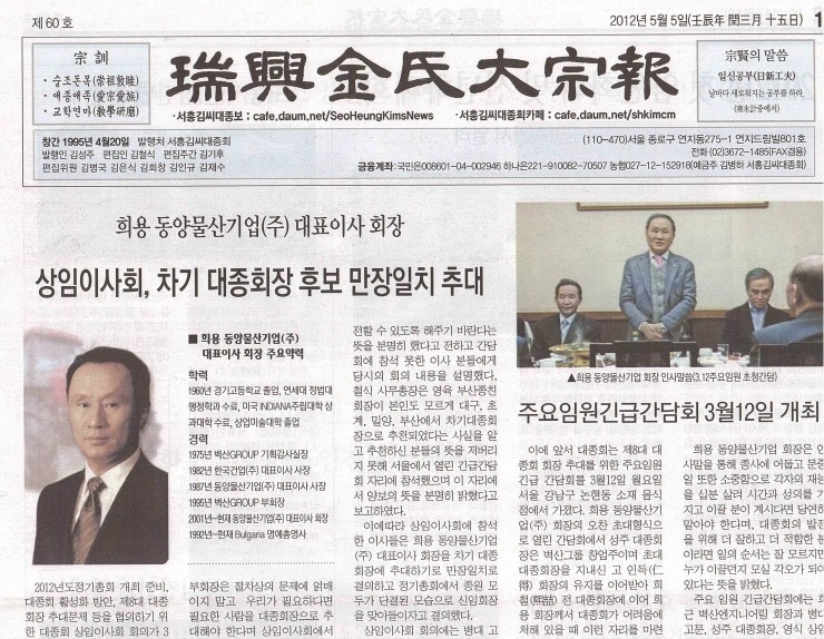 이에따라 상임이사회에 참석한 이사들은 희용 동양물산기업(주) 대표이사 회장을 차기 대종회장에 추대하기로 만장일치로 결의하고 정기총회에서 종원 모두가 단결된 모습으로 신임회장을 맞아들이자고 결의했다. 이밖에 금년 5월5일 대종회 정기총회 개최 준비와 관련, 병국(炳國) 사무차장이 전년도 미비했던 점을 보완하고 상임이사회 회의에서 개진된 임원님들의 좋은 의견들도 수렴하여 재경서흥회와 청장년회가 협력하여 차질 없이 준비해나가겠다고 보고했다.
