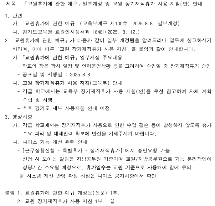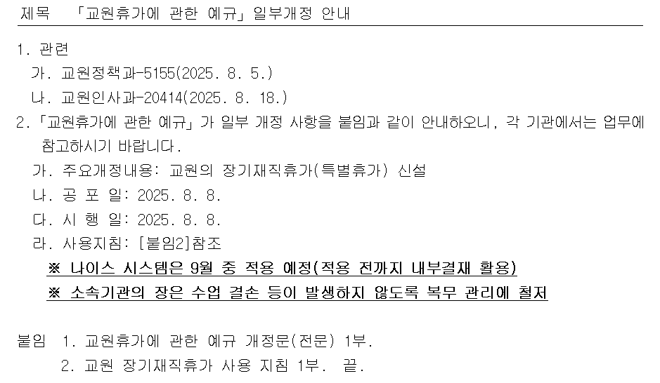[교원복무]장기재직휴가 - 교원사용지침(안) 제공 / 교육부, 교육청 작성자교육정보부장교사|작성시간25.08.21|조회수1,476 목록 댓글 13 글자크기 작게가 글자크기 크게가 (질문드려요.. 어느게시판에 써야할지모르겠ㅅ습니다) ;; (3탄) 장기재직휴가, 드디어 사용 '지침' 나왔다!요즘 가장 핫한 '장기재직휴가' 지난 8일 시행일로 공표가 된 후로 많은 문의와 요청이 있다고 ...blog.naver.com **공문참고경기도교육청**충남교육청 다음검색 현재 게시글 추가 기능 열기 북마크 공유하기 신고 센터로 신고 댓글 댓글 13 댓글쓰기 답글쓰기 댓글 리스트 답댓글 작성자시나브로5 | 작성시간 25.08.28 국가(교육)공무원에 해당되지 않아서인듯 합니다. 답댓글 작성자aacyn | 작성시간 25.08.28 william 상세한 답변 감사합니다~~^^ 답댓글 작성자aacyn | 작성시간 25.08.28 시나브로5 네~~감사합니다 작성자오랜촌놈 | 작성시간 25.09.10 감사합니다. 작성자kiki0 | 작성시간 25.10.09 감사합니다 댓글 전체보기