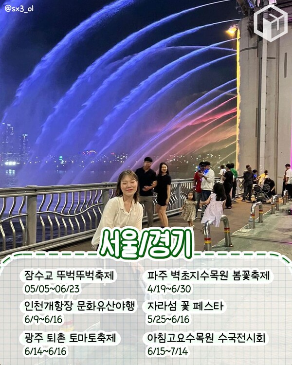 서울과 경기, 인천 지역 곳곳에서는 6월 야외에서 진행되는 축제가 가득합니다. 매주 일요일 잠수교의 차량 통행을 통제하고 플리마켓과 먹거리, 각종 공연이 펼쳐지는 뚜벅뚜벅축제는 6월 23일까지 진행되는데요. 상반기 일정이 끝나면 하반기 축제 또한 예정되어 있습니다.
