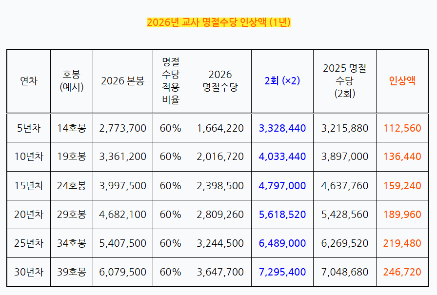 [교원보수]2026년 교사 명절수당 인상액 작성자@반달곰|작성시간26.01.06|조회수2,646 목록 댓글 7 글자크기 작게가 글자크기 크게가 [명절휴가비/명절수당]명절수당이라고 불리는 명절휴가비는 설날과 추석날에 지급되며, 본봉의 60%를 받습니다.2026년 명절수당과 호봉 인상에 따른 인상금액을 계산해보면 다음과 같습니다. 다음검색 현재 게시글 추가 기능 열기 북마크 공유하기 신고 센터로 신고 댓글 댓글 7 댓글쓰기 답글쓰기 댓글 리스트 작성자우리피그 | 작성시간 26.01.06 감사합니다!! 작성자나만의 별 | 작성시간 26.01.07 감사합니다. ^^ 작성자브라운 | 작성시간 26.01.08 좋네요👍👍 작성자hsurt | 작성시간 26.01.12 감사합니다 작성자드라큘라 | 작성시간 26.01.16 감사합니다 댓글 전체보기