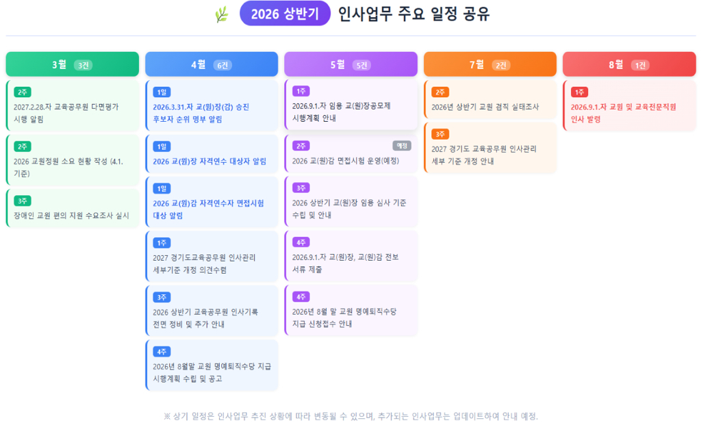2026 상반기 인사업무 주요 일정 / 경기도교육청 작성자랜디|작성시간26.03.09|조회수606 목록 댓글 1 글자크기 작게가 글자크기 크게가 다음검색 현재 게시글 추가 기능 열기 북마크 공유하기 신고 센터로 신고 댓글 댓글 1 댓글쓰기 답글쓰기 댓글 리스트 작성자태권만두 | 작성시간 26.03.10 감사합니다 랜디님~ 혹시 장학사 전형은 2학기에 시행한다고 봐도 될까요?^^ 댓글 전체보기