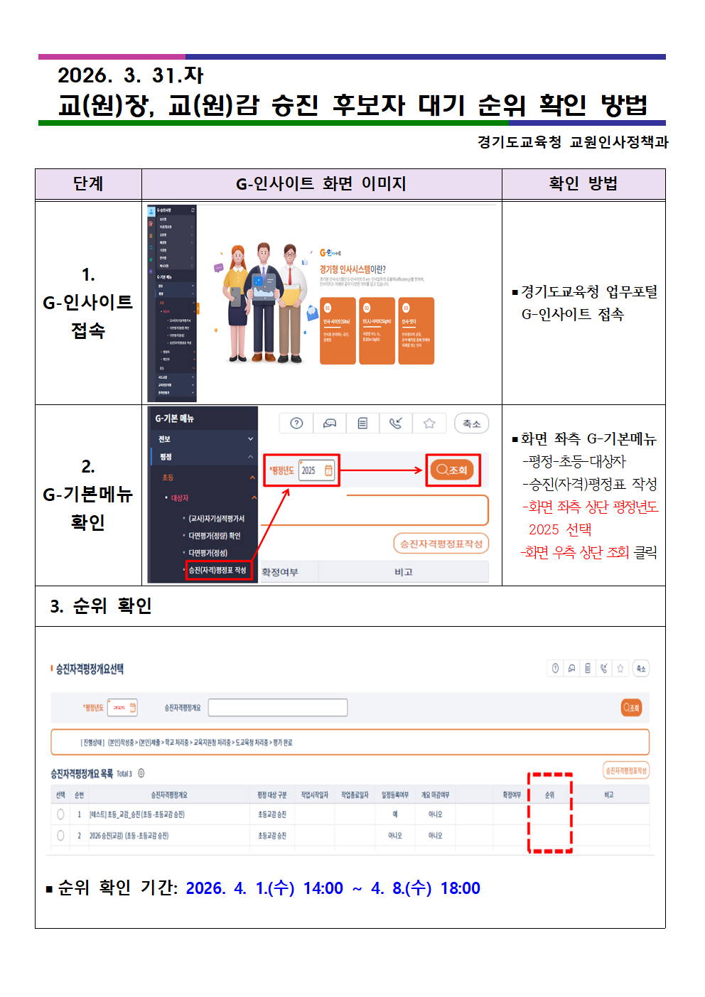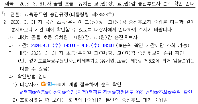 교(원)장, 교(원)감 승진 후보자 대기 순위 확인 방법(초등, 유치원) / 경기도교육청 작성자랜디|작성시간26.03.31|조회수2,118 목록 댓글 7 글자크기 작게가 글자크기 크게가 다음검색 현재 게시글 추가 기능 열기 북마크 공유하기 신고 센터로 신고 댓글 댓글 7 댓글쓰기 답글쓰기 댓글 리스트 작성자I am J | 작성시간 26.03.31 대상자가 있는 학교에만 공문이 오나봅니다. ^^ 작성자블랙 젤라 | 작성시간 26.03.31 감사합니다 작성자아레테 | 작성시간 26.04.01 감사합니다~ 작성자멋져부러 | 작성시간 26.04.01 초등은 항상 마루타니까 가능합니다. 작성자압구정박선생 | 작성시간 26.04.01 와. 정확하게 14시에 올라오나봐요. 아직도... 댓글 전체보기