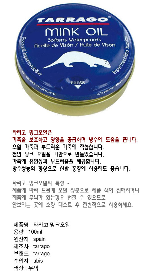 타라고 밍크오일은 가죽을 보호하고 영양을 공급하며 방수에 도움을 줍니다.