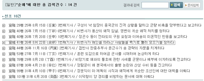 이들에 관한 첫번째 기록은 조선관리와 중국장수가 대화하는 도중에 중국장수가 이들에 관한 언급을 하면서 등장합니다. 아래의 사진을 보면 25년 이후 28년을 제외한 전쟁이 끝나는 30년까지 끊임없이 등장하며, 전쟁이 끝나고 1년 후에도 실록에서 언급되는 자들이 왜군에게 붙어버린 조선인들, 즉 순왜라는거지요 -_-; |